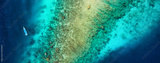 Panoramic view on the coral reef and boat. Azure water background from top view. Summer seascape from air. Travel - image