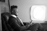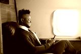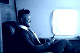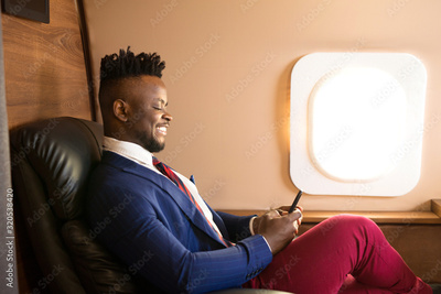 handsome african young man in a suit in the cabin of a private plane with a phone in his hands