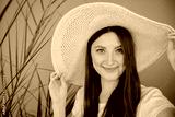 Beautiful elegant lady in hat studio shot. Abstract background horizontal view summer vacation concept copyspace
