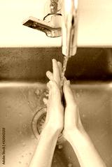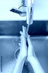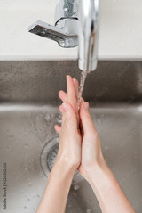 Asian woman washing hands in a sink