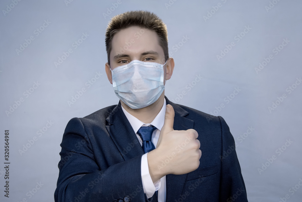 Portrait of a young man in a suit and medical mask. Holds the finger up, all right. Individual protection of office workers from epidemics and viruses, personal security tools.