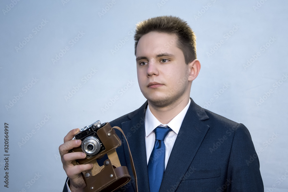 Portrait of a young man in a suit with an old camera, perhaps he is a novice journalist doing a report, a diplomat or secret agent photographing documents, a businessman collecting dirt