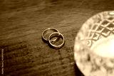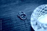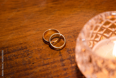 wedding rings on wooden table