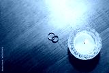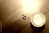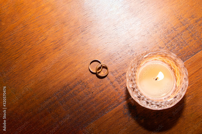 wedding rings and candle on wooden table