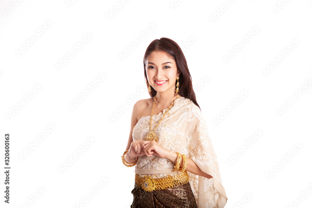 Asian Thai beautifu women welcome with traditional Thai suit in studio on white background
