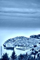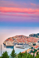 Aerial view at famous european travel destination in Croatia, Dubrovnik old town, Dalmatia, Europe. UNESCO list. Fort Bokar seen from south old walls on a sunny day in dramatic light..