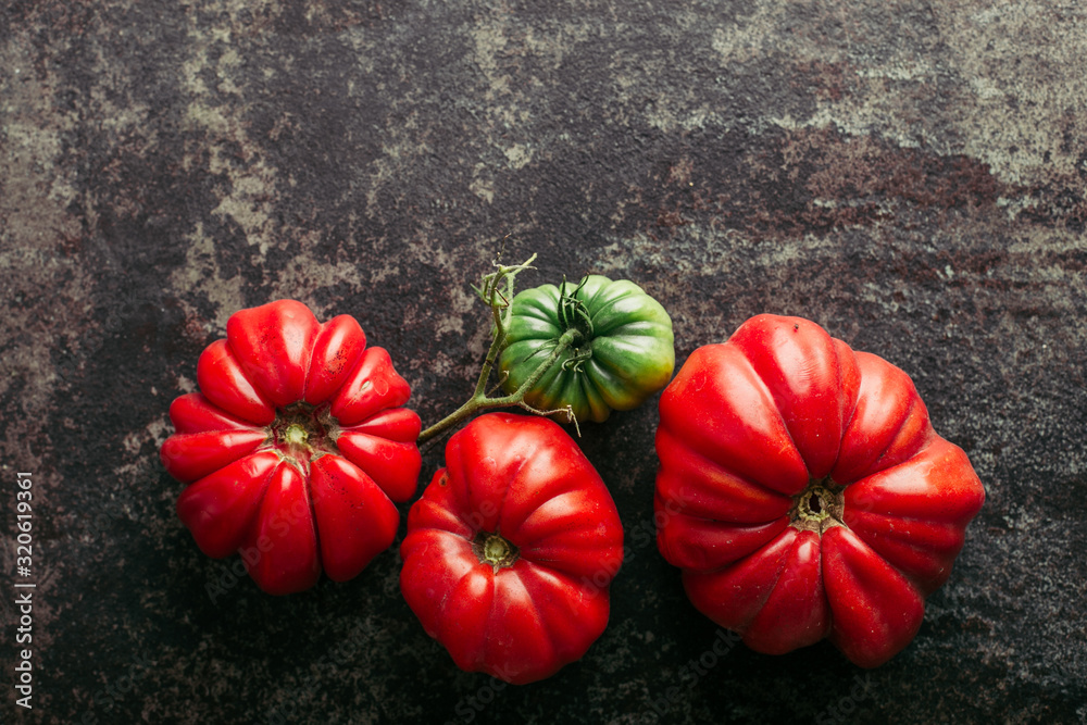 Fresh, ripe tomatoes on dark metal background.