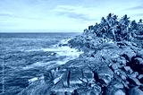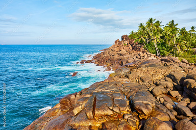 Rocky shore of the Indian Ocean in Unawatuna on a sunny day, Sri Lanka.