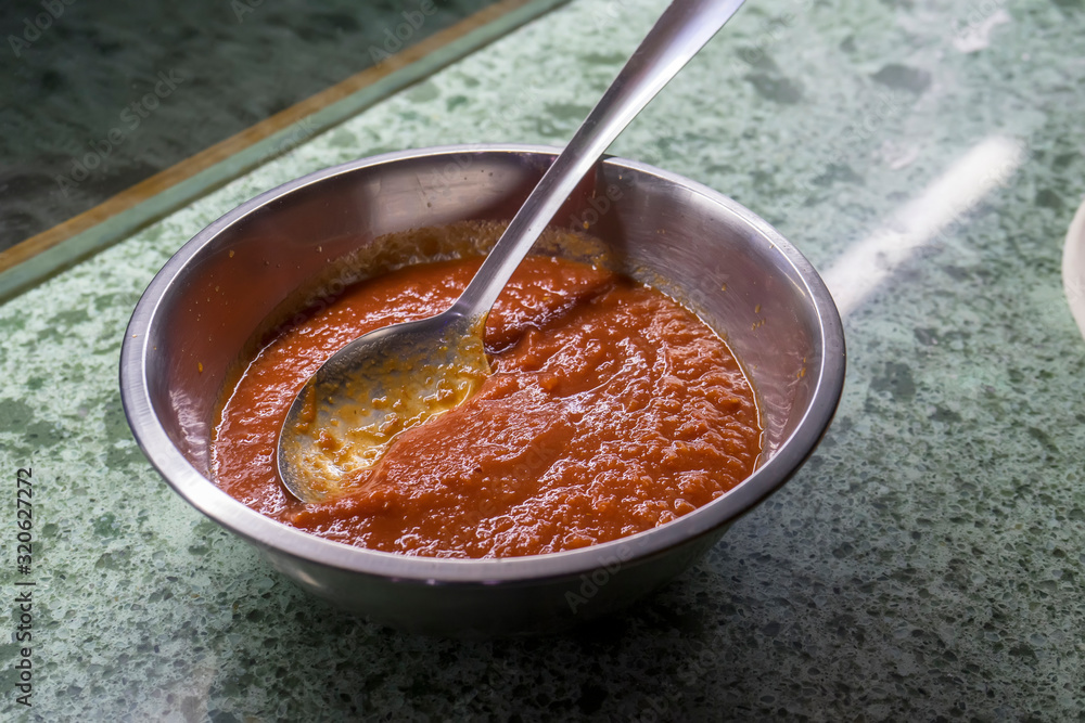 A bowl of tomato paste is on the table, cooking pizza