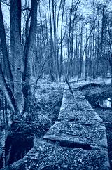 Old broken wooden bridge in a freshwater swamp forest, color toning applied.