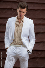 Portrait of handsome young man on wooden background.