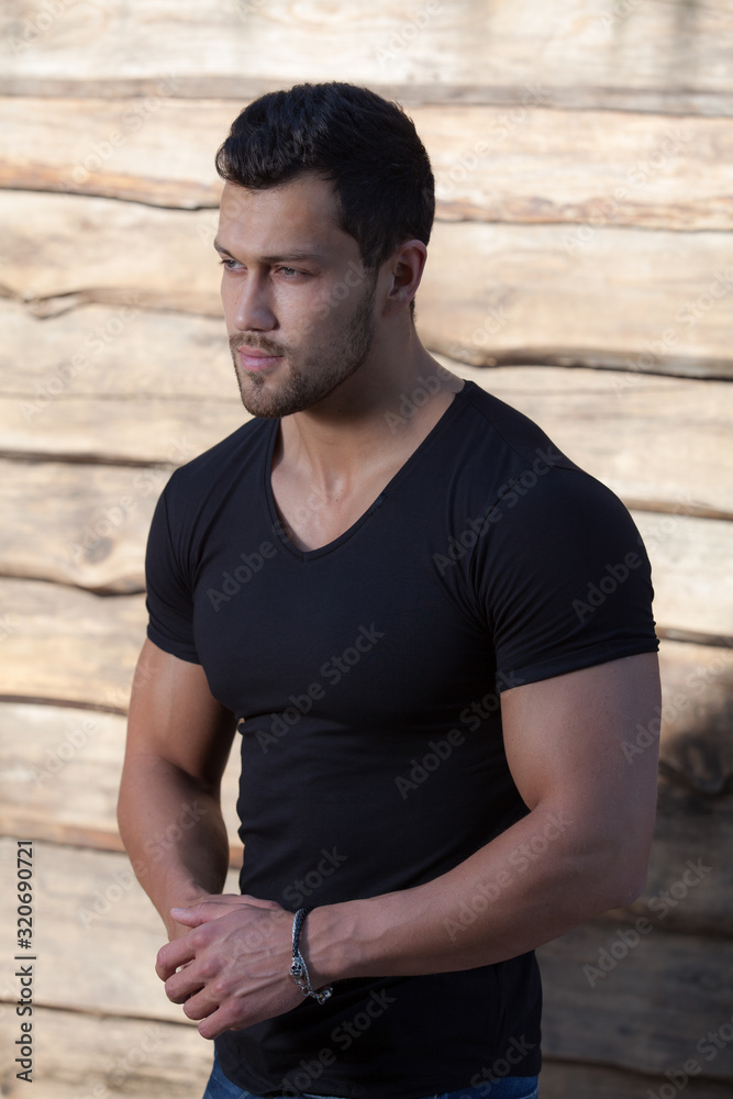 Portrait of handsome young man on wooden background.
