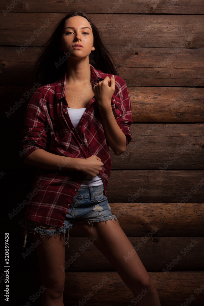 Portrait of beautiful young girl on wooden background.
