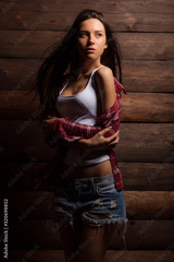 Portrait of beautiful young girl on wooden background.