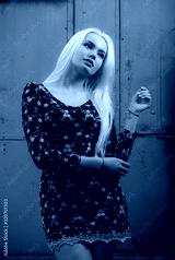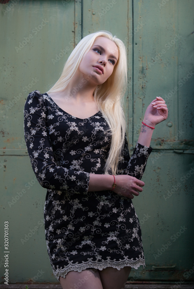 Portrait of beautiful young girl on metall background.