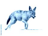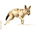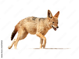 Isolated on white background, Black Backed Jackal, Canis Mesomelas walking on the sand dune. Low angle, african wildlife, Dorob national park, Namibia.