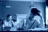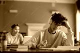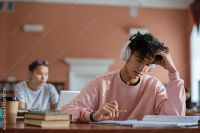Pensive teenage student with headphones looking through page of manual before rewriting information in his notebook