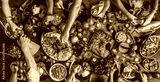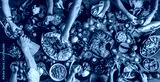 Turkish cuisine family feast. Flat-lay of peoples hands and lamb chops with quince, beans, salad, babaganush, rice pilav, pumpkin dessert, lemonade over rustic table, top view. Middle East cuisine