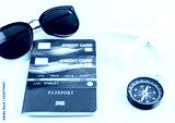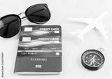 Passports and credit cards,sunglases,airplane on white