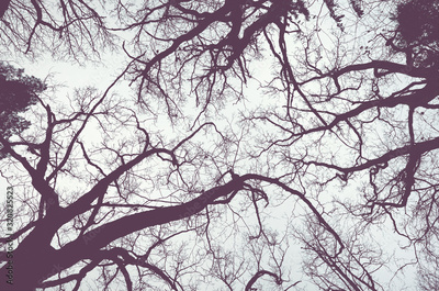 Looking up at tree branches silhouettes, abstract color toned natural background.