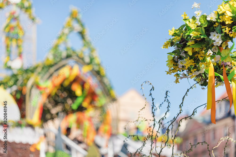Blurred background of Easter market at the Old Town Square in Praguet, Czech republic, copy space