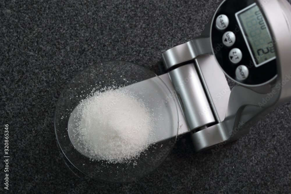 Weighing sugar on kitchen scale. Making Golden Syrup Series.
