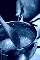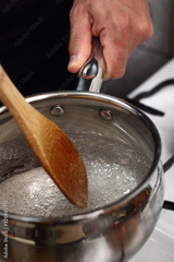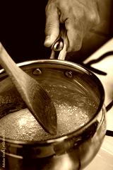 Stirring sugar mixture with wooden spoon. Making Golden Syrup Series.