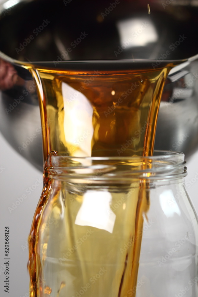 Pouring syrup into sterilised jars. Making Golden Syrup Series.