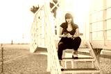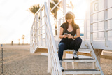 Beautiful young woman sitting on a the lifeguard booth using smart phone at beach during sunset