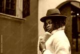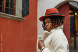 Outdoor close up portrait young elegant confident african american woman wearing stylish orange hat, wrist watch, winter white faux fur coat, posing in street of city. Copy, empty space for text