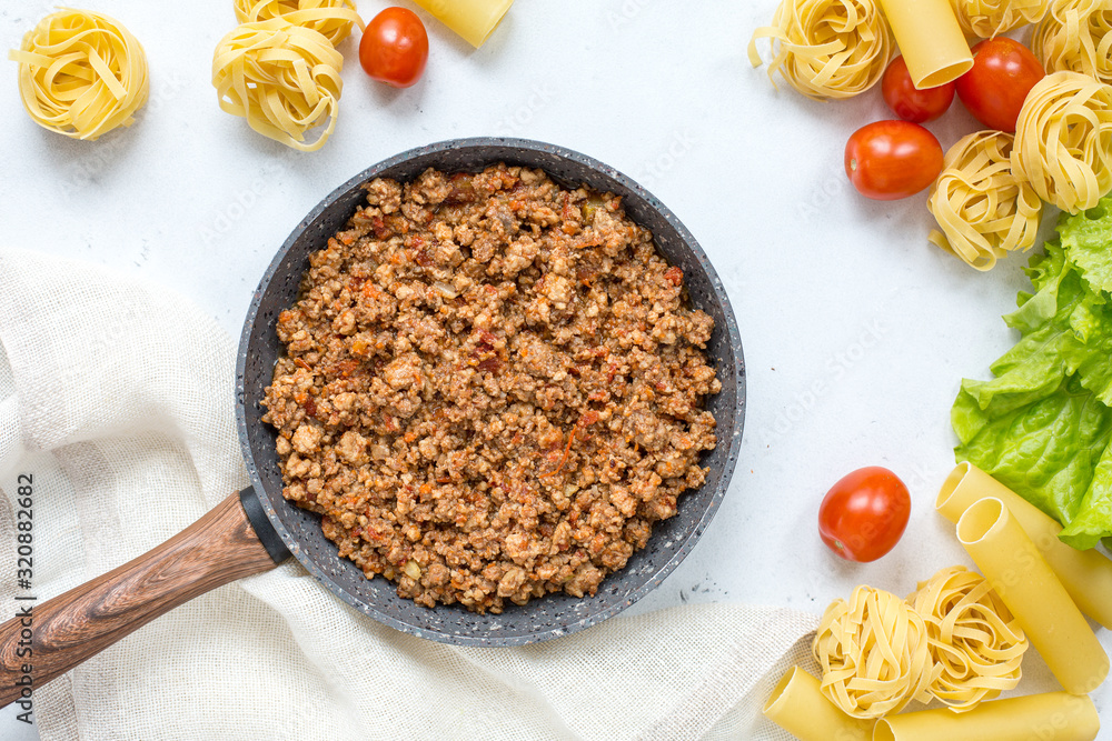 Hot pan with meat ragu for pasta - Bolognese sauce. Homemade, traditional recipe. Italian food.