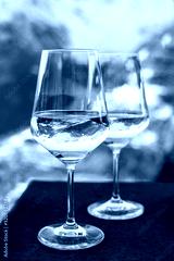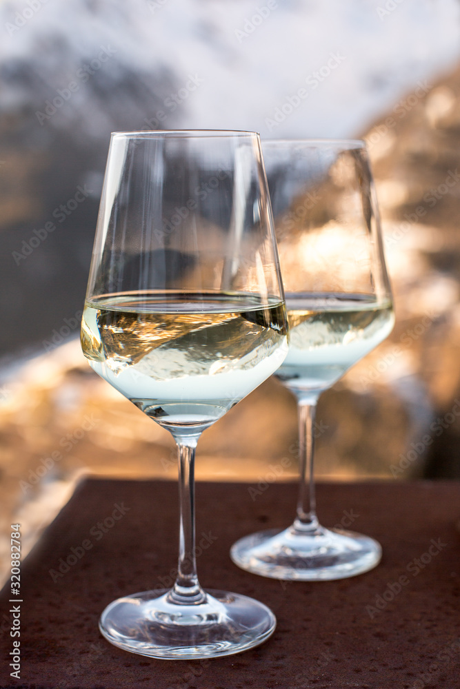 Two glasses with white wine and reflections of mountains. Italian Alps.