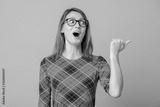 Portrait of amazed and excited brunette female pointing with forefinger