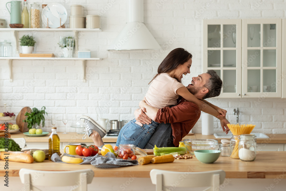 Happy husband and wife having fun during cooking