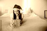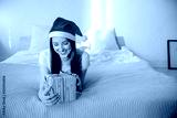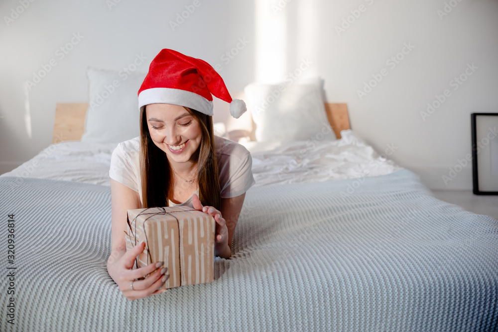 Portrait of a beautiful woman wearing a santa hat smiling. Woman with presents horizontal view presents and celebration concept.