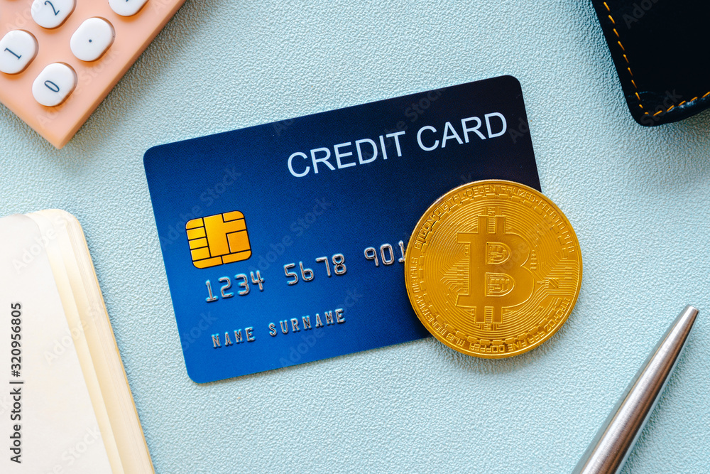 Credit card bitcoin calculator and notebook with pen on pastel color background.