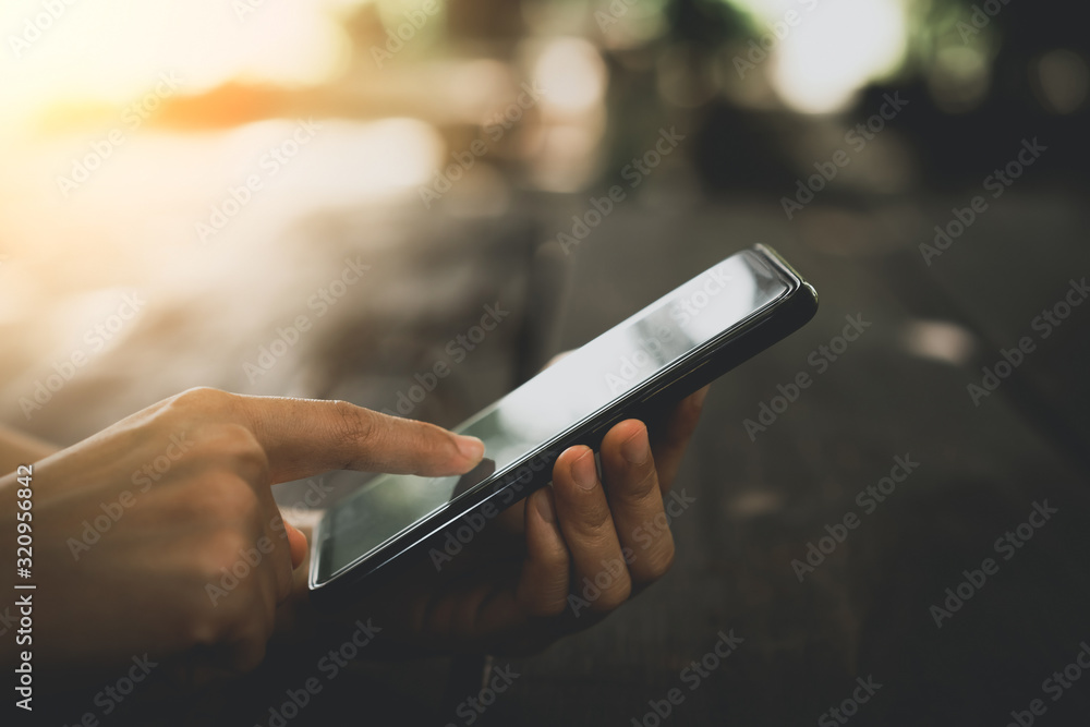 Woman hand using smart phone at coffee shop. Technology business concept.