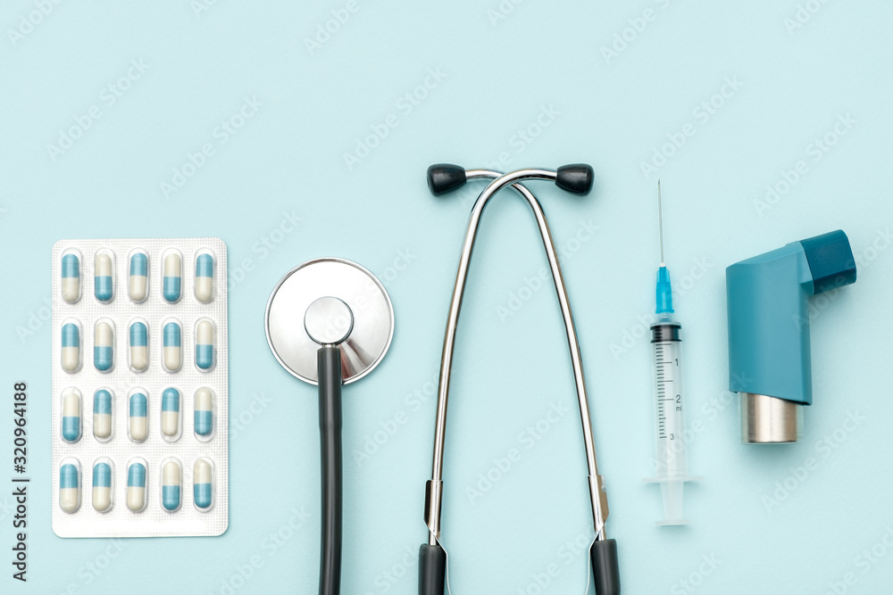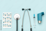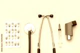 Top view of doctor's table with stethoscope and other equipment
