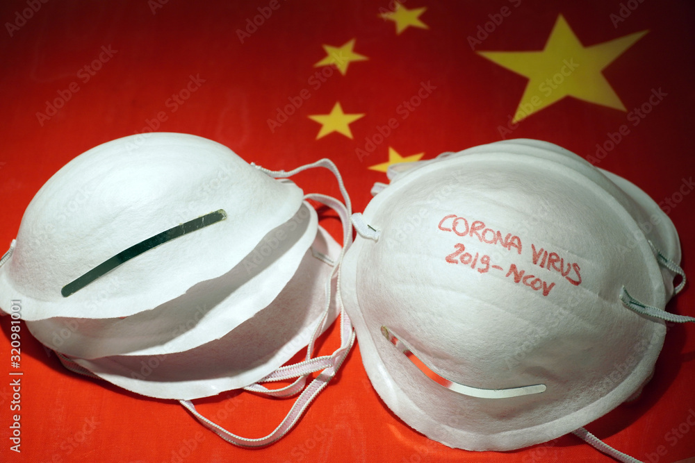 Novel coronavirus - 2019-nCoV, WUHAN virus concept. Surgical mask protective mask with CORONAVIRUS text. Chinese coronavirus outbreak. Red China flag background and money euro