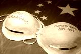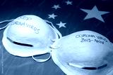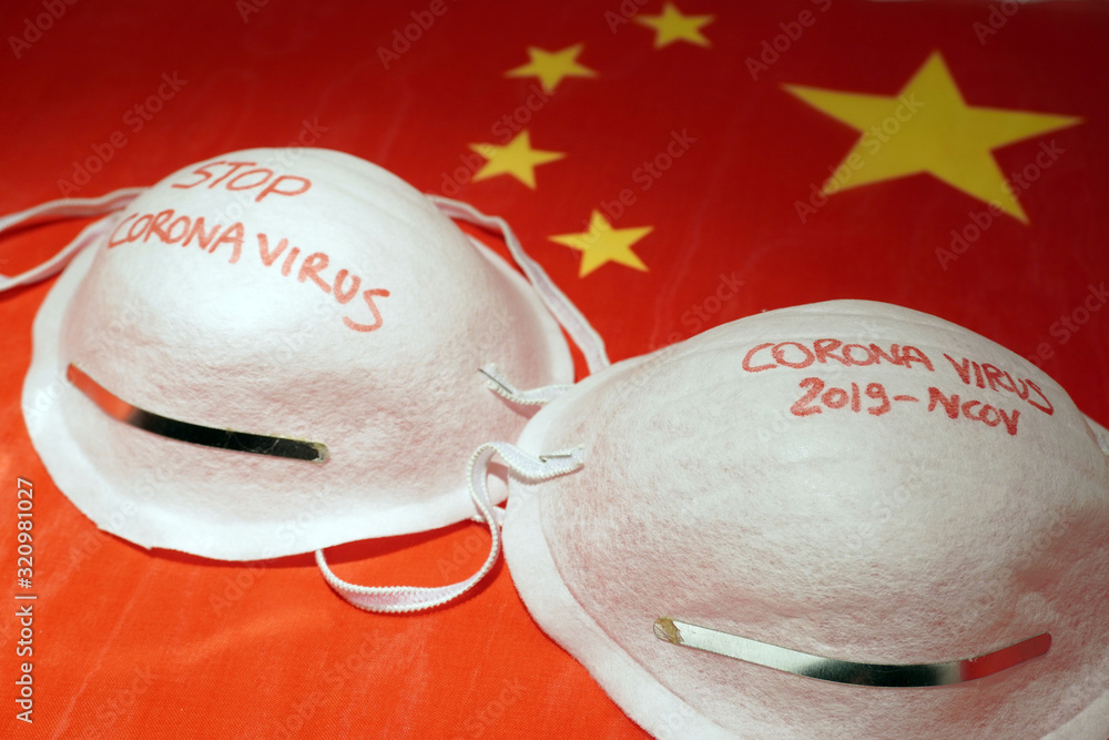 Novel coronavirus - 2019-nCoV, WUHAN virus concept. Surgical mask protective mask with CORONAVIRUS text. Chinese coronavirus outbreak. Red China flag background and money euro