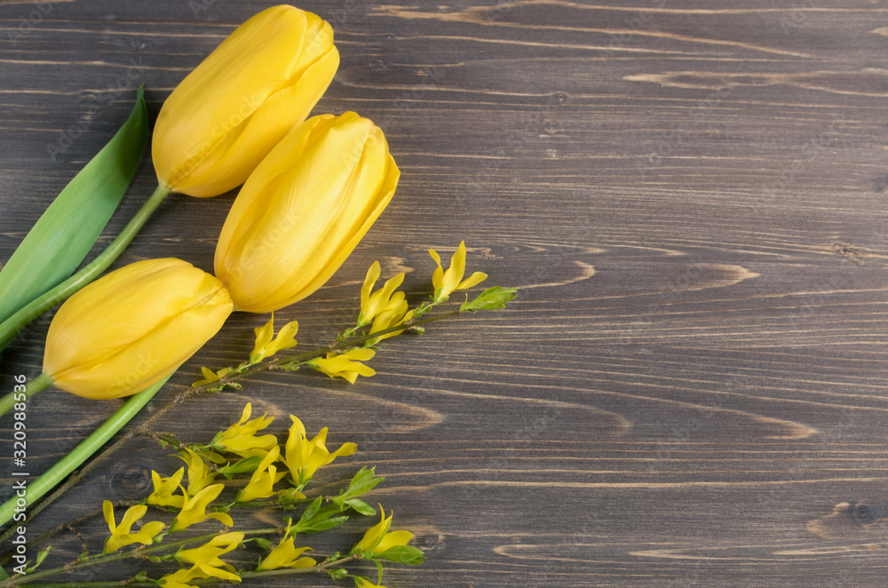 Yellow Tulip flowers and spring forsythia branch on brown wooden table background, copy space, springtime