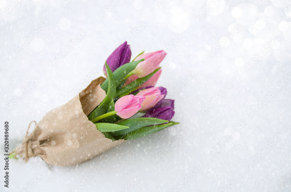 Pink tulips flowers with green leaves in a paper bag in the snow, copy space