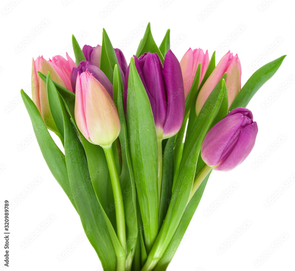 Bouquet of colorful spring Tulip flowers with green leaves on stem isolated on a white background
