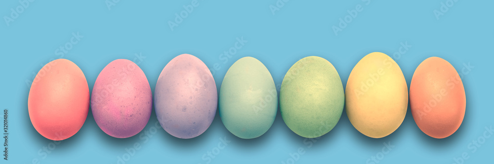 Pastel painted Easter eggs aligned in a row on blue panoramic background, Easter web banner