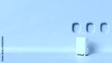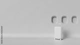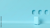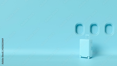 Travel luggage mockup, blue pastel colors in empty studio room, airplane windows, space for text, traveling background. Tourist minimalist concept, summer baggage trip, porthole mockup, front view.