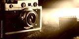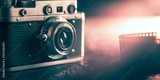 Photo camera on dark background. Close up of old retro things shooted with vintage style colors and toned. Flyer for your ad. Concept of retro style, history return, fashioned things, hobby, memories.