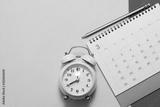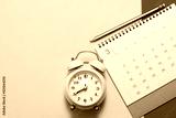 close up of calendar and alarm clock on the yellow table background, planning for business meeting or travel planning concept