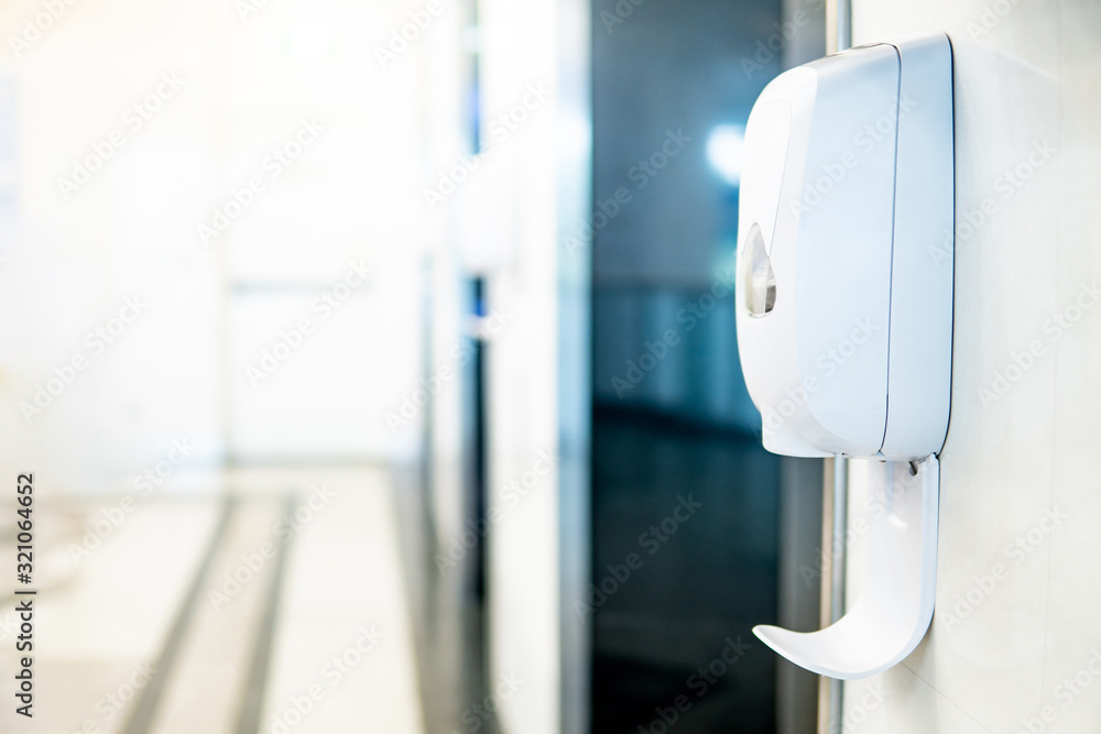 Automatic alcohol dispenser for cleaning hand in hospital. Infection prevention concept. Save and clean in public medical center area.