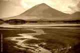 Pink lesser Flamingos at Lake Natron with Ol Doinyo Lengai volcano on background in Rift valley, Tanzania