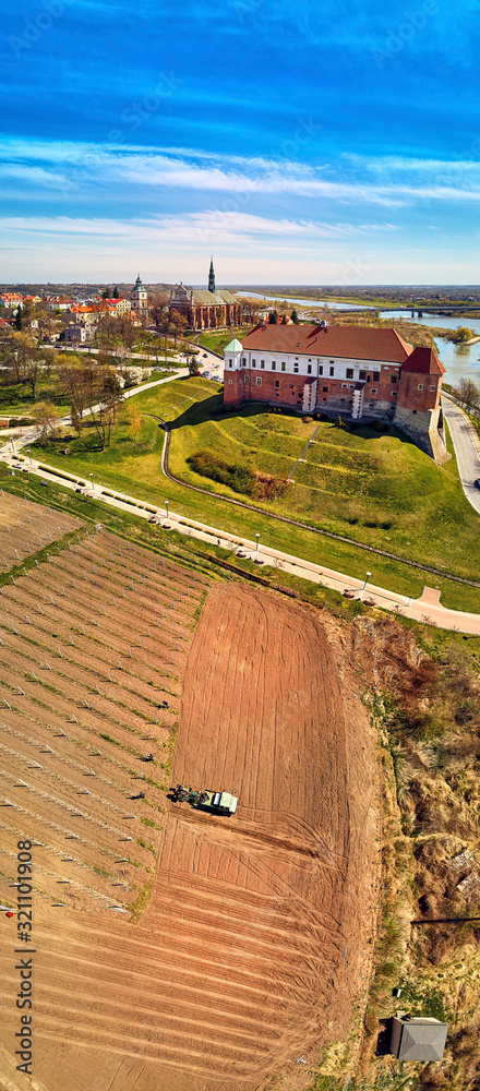 Beautiful panoramic aerial drone view to the Sandomierz Royal Castle - planting vines in the vineyard of St. Jakub - near the monastery and Church of St. Jakub in Sandomierz, Poland